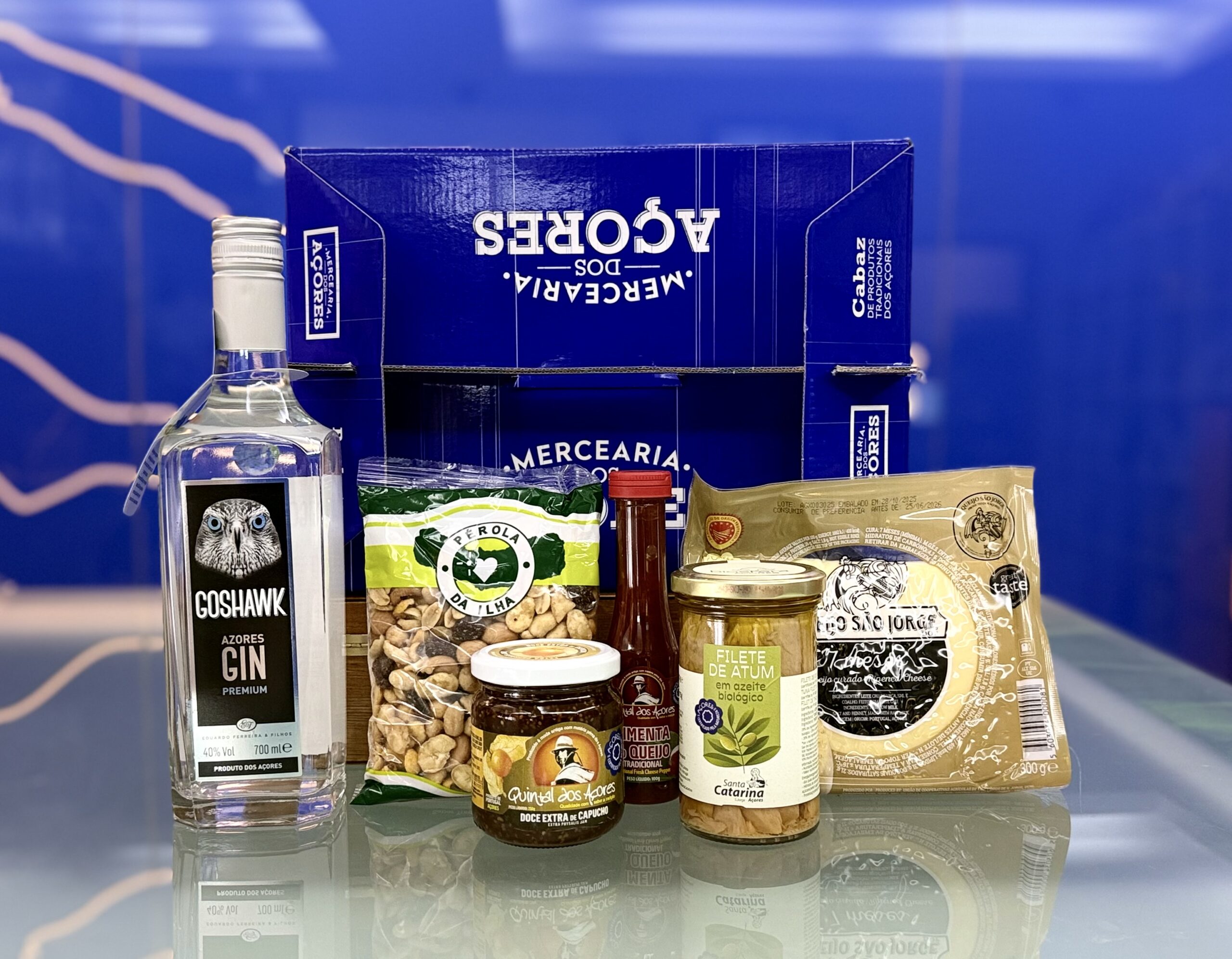 Cabaz em caixa de cartão com imagens alusivas aos Açores: